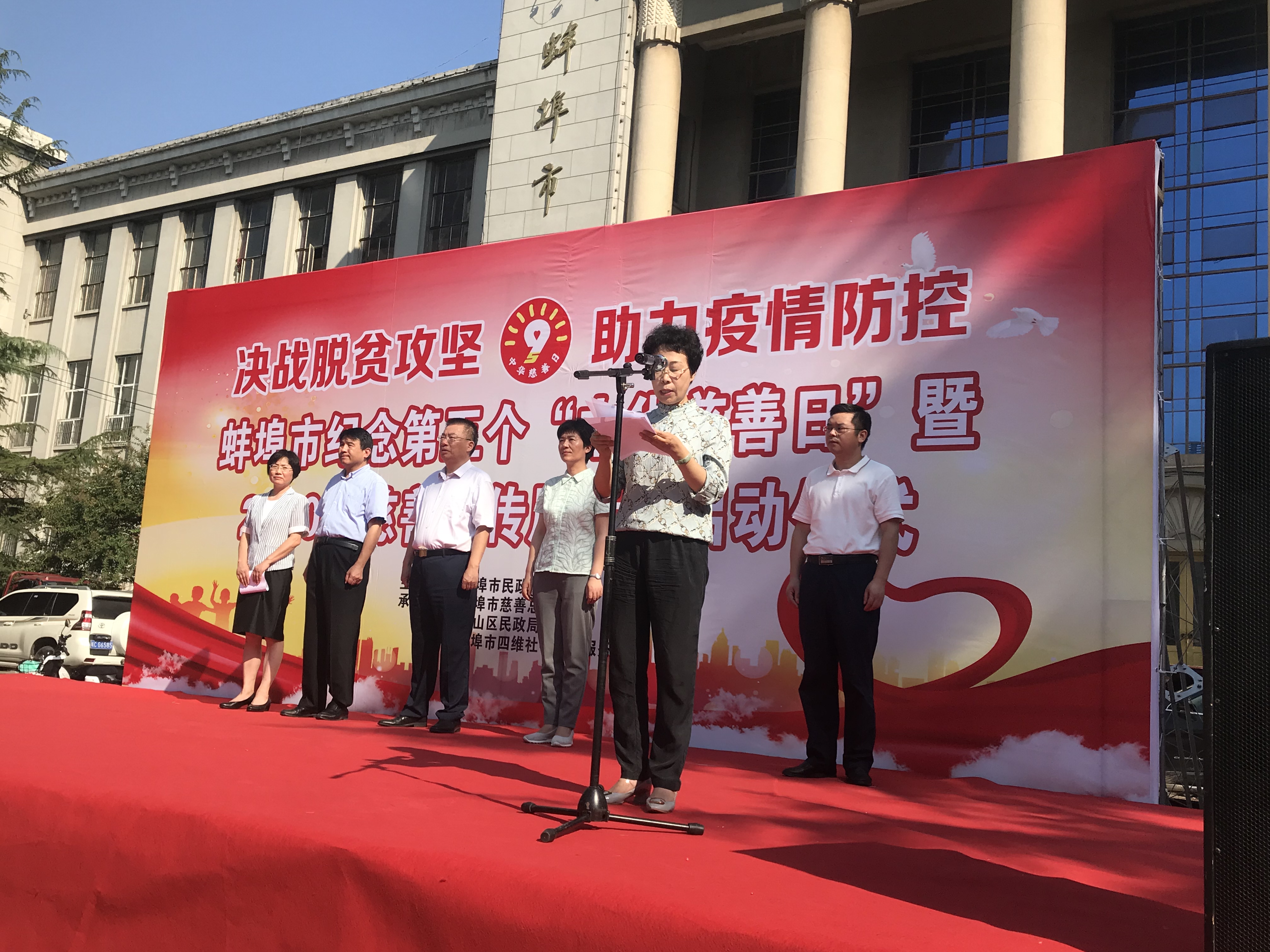 蚌埠市纪念第五个“中华慈善日”暨2020年慈善宣传周活动启动仪式于2020年9月5日上午在市科学文化宫广场举行。市人大常委会副主任王庆国、市政府副市长张晓静、市政协副主席鲍子雨等市领导出席会议。市民政局党委书记、局长刘雪洁致辞,局党委委员、市社救中心主任张群宣读《关于授予在疫情防控期间做出突出贡献的21家企业“最佳爱心企业”荣誉称号的决定》。
