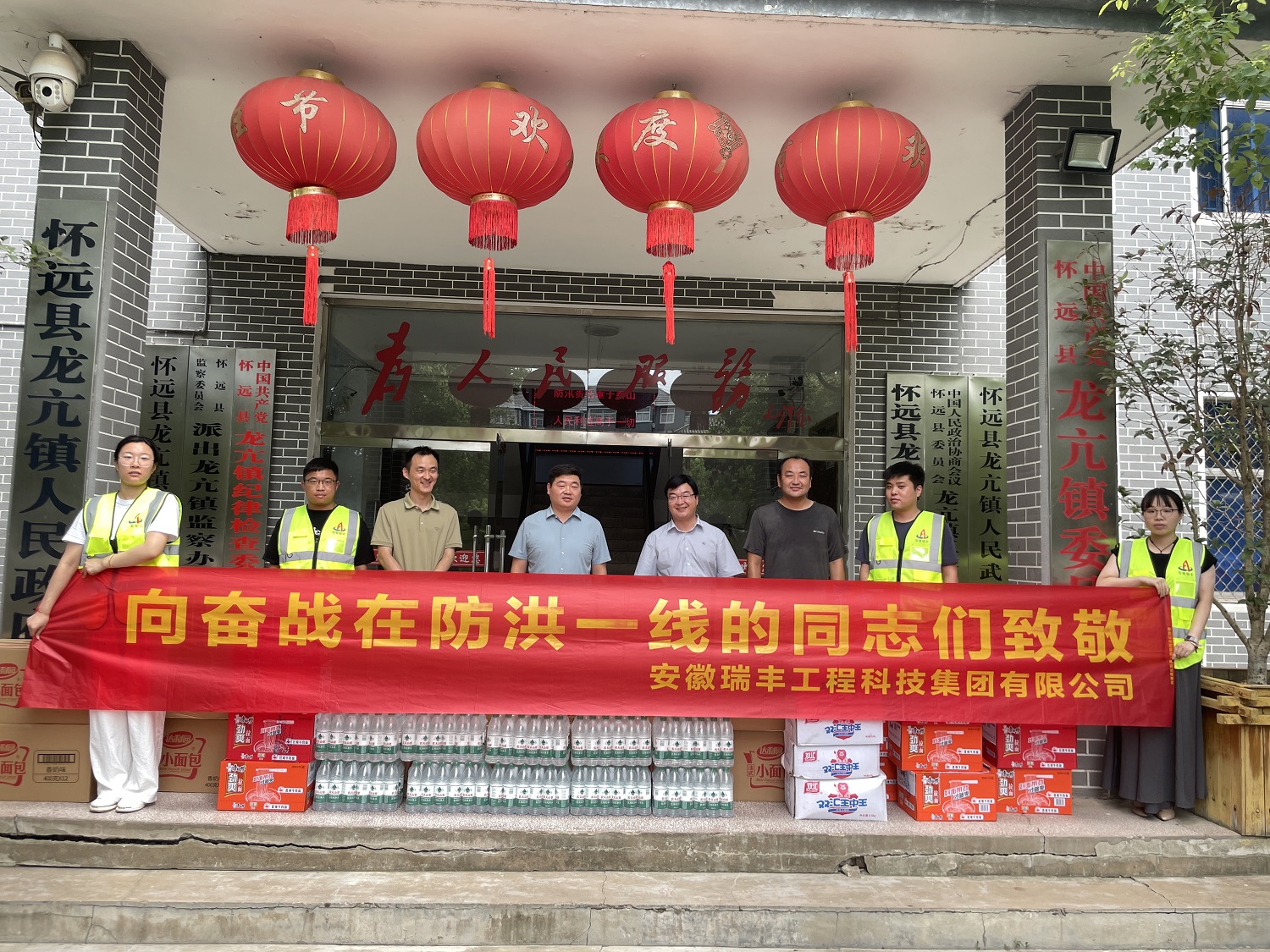 近日以来,受连续降水和上游泄洪的影响,怀远境内的淮河和涡河段水位已超过警戒线,为防止汛情发生,怀远县淝南镇和龙亢镇的干部群众昼夜奋战,24小时值班巡堤,责任重大,也十分辛苦。集团公司为表达对这些一线人员的敬意和工作的支持,特为他们送去矿泉水、食品等物资,以解不时之需。淝南镇镇长年飞和龙亢镇镇长周家波对集团公司的关心和捐赠表示诚挚感谢,并代表奋战在一线的工作人员表达了对安徽瑞丰集团公司的感激之情。