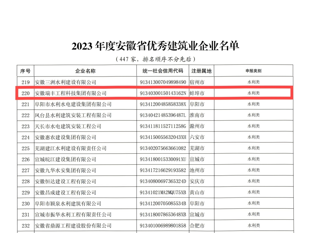 “安徽省优秀建筑业企业”是对全省建筑业企业综合实力的认定,由省住房城乡建设厅、省交通厅、省水利厅、省通信管理局共同实施,旨在充分发挥优秀建筑业企业的示范引领作用,提升建筑业企业综合竞争力,锻造和打响“安徽建造”品牌。